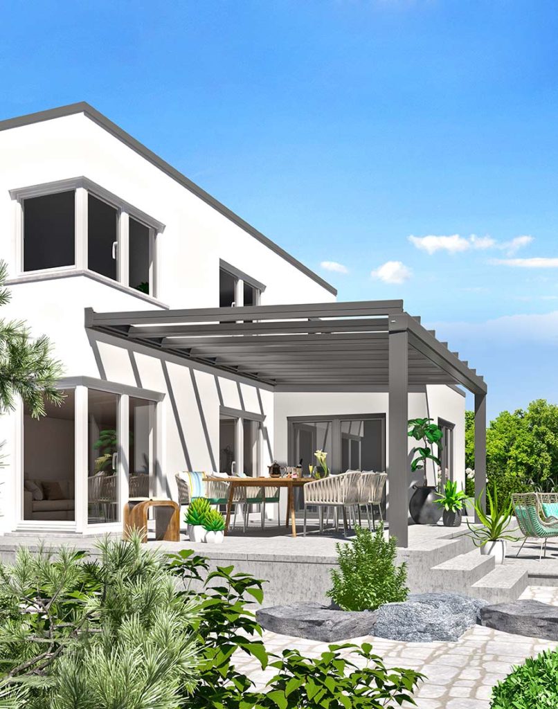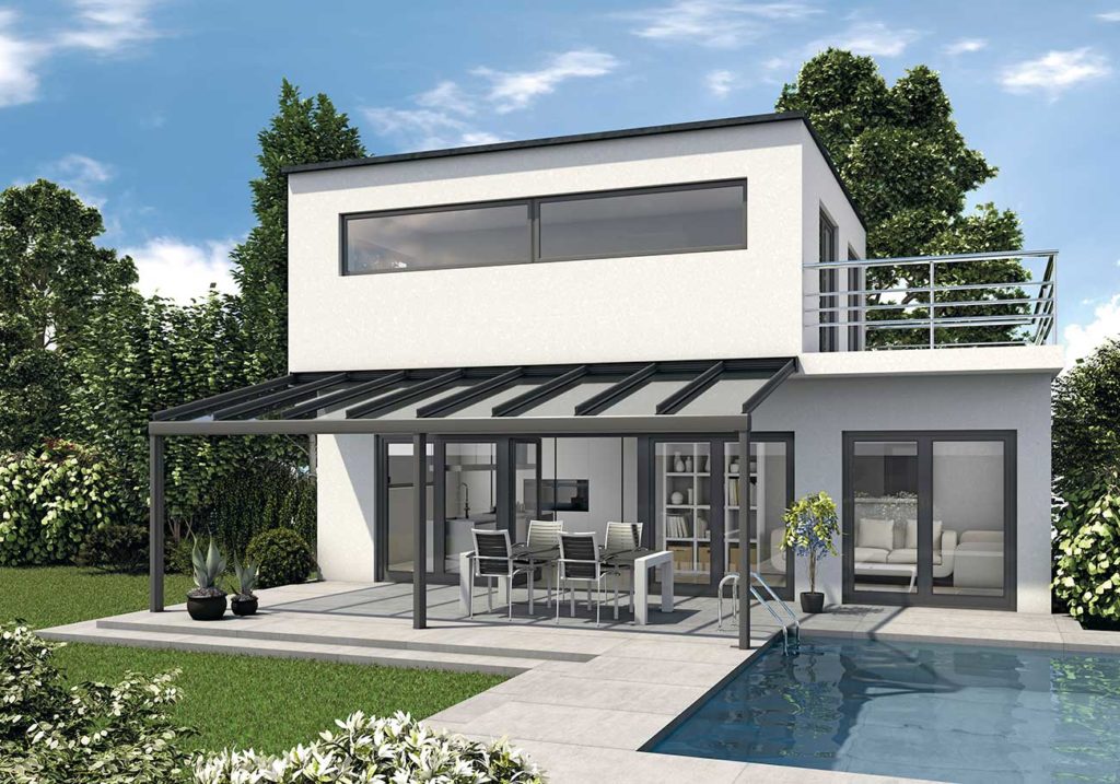 Moderne Architektur ist sehr kubisch, geradlinig und klar. Die Terrasse liegt meist frei neben dem Baukörper. Hier haben sich Terrassendächer in den letzten Jahren durchgesetzt: Die klare Alumiunium-Konstruktion mit Glasdach passt ideal zu jedem modernen Gebäude. Der beste Platz, um Licht und Sonne zu genießen.