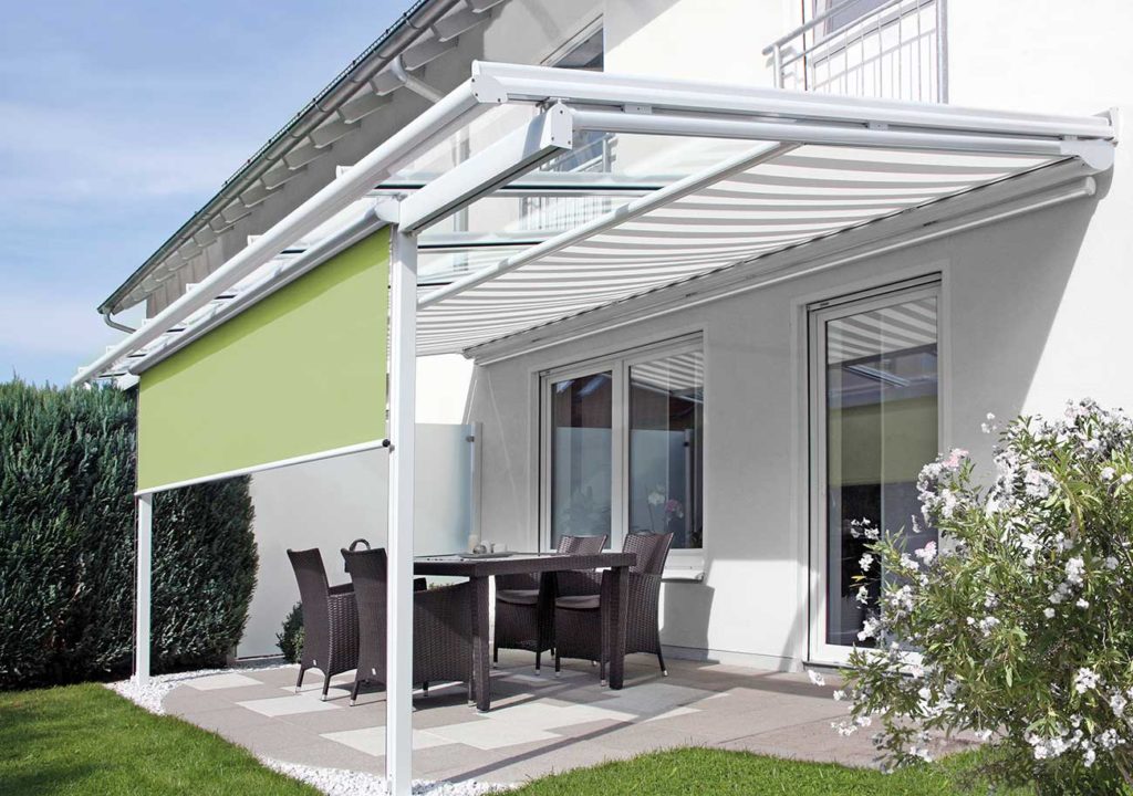 Unter Glas wärmt es sich schnell auf. Das ist der Vorteil, den Sie mit einem Terrassendach bewusst schaffen wollen, um an kühlen Abenden oder in der Übergangszeit länger draußen sitzen können. Im Hochsommer kann es allerdings sehr heiß werden. Das ist der Vorteil vom modularen System bei einem Terrassendach von ERHARDT. Hier gibt es den Sicht- und Sonnenschutz dazu. Alle Halterungen und Führungsschienen passen bereits für die notwendige Zusatzausstattung. Auch nachträglich.
